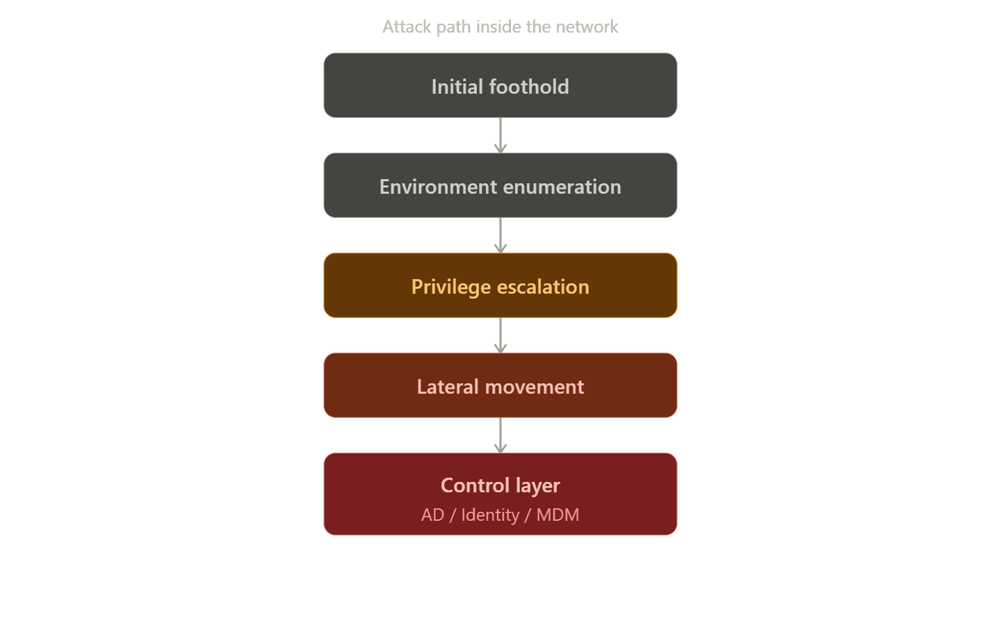 At a certain point, the objective is to reach a control layer, something like Active Directory, identity infrastructure, or a centralized management system. Once that happens, the attacker doesn’t need to move laterally anymore.